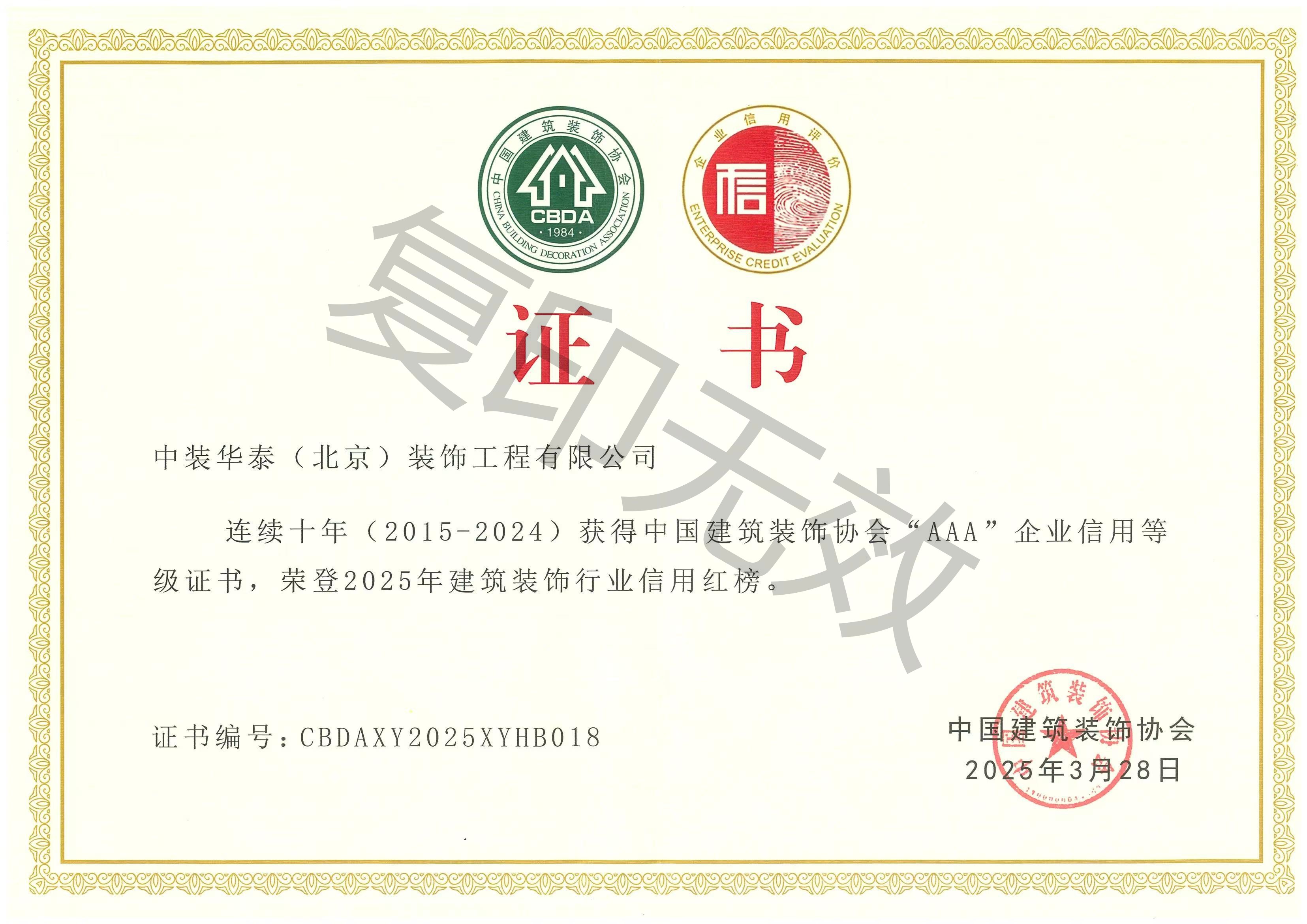 中装协AAA企业信用等级证书,荣登2025信用红榜